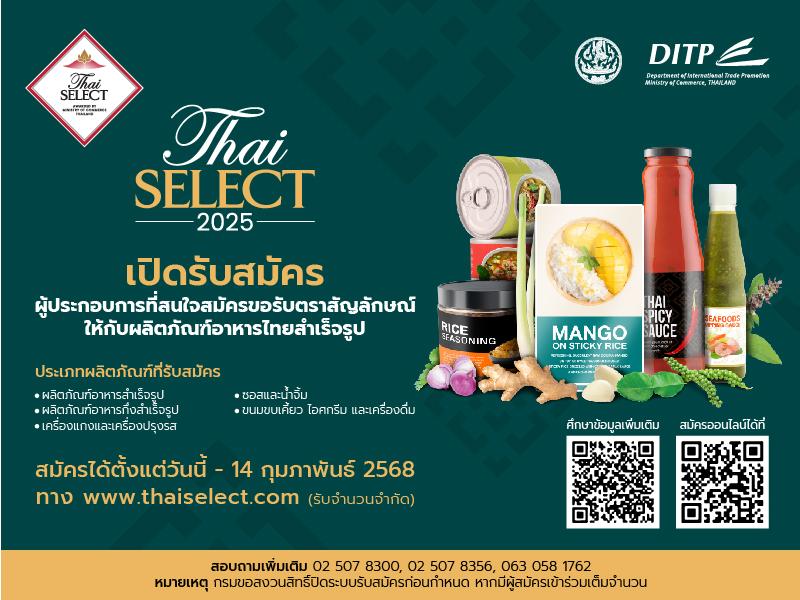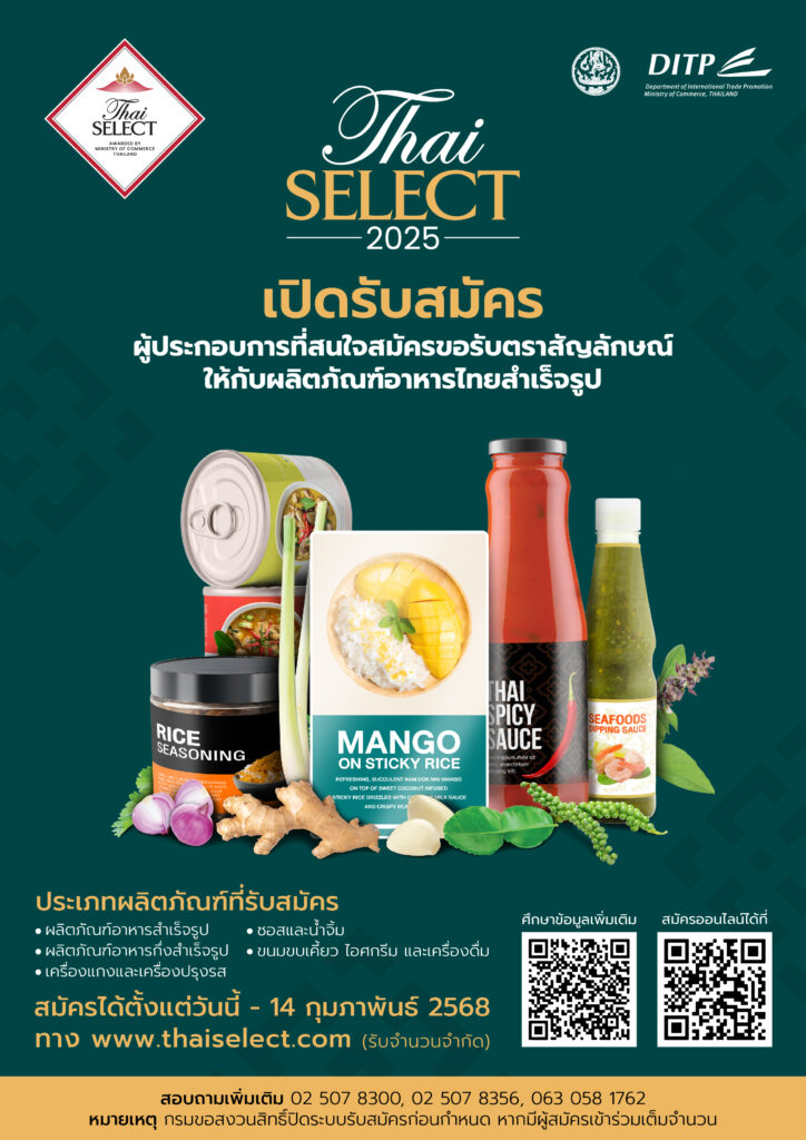 โครงการส่งเสริมผลิตภัณฑ์อาหารไทยสำเร็จรูปโดยการมอบตราสัญลักษณ์ Thai SELECT ประจำปี 2568 เป็นกลไกสำคัญในการส่งเสริมการส่งออกอาหารไทย สร้างมูลค่าเพิ่มให้กับผลิตภัณฑ์ และยกระดับภาพลักษณ์อาหารไทยในตลาดโลก ซึ่งนอกจากจะช่วยเพิ่มมูลค่าการส่งออกแล้ว ยังเป็นการรักษาและส่งเสริมวัฒนธรรมอาหารไทยให้เป็นที่รู้จักและยอมรับในระดับสากล